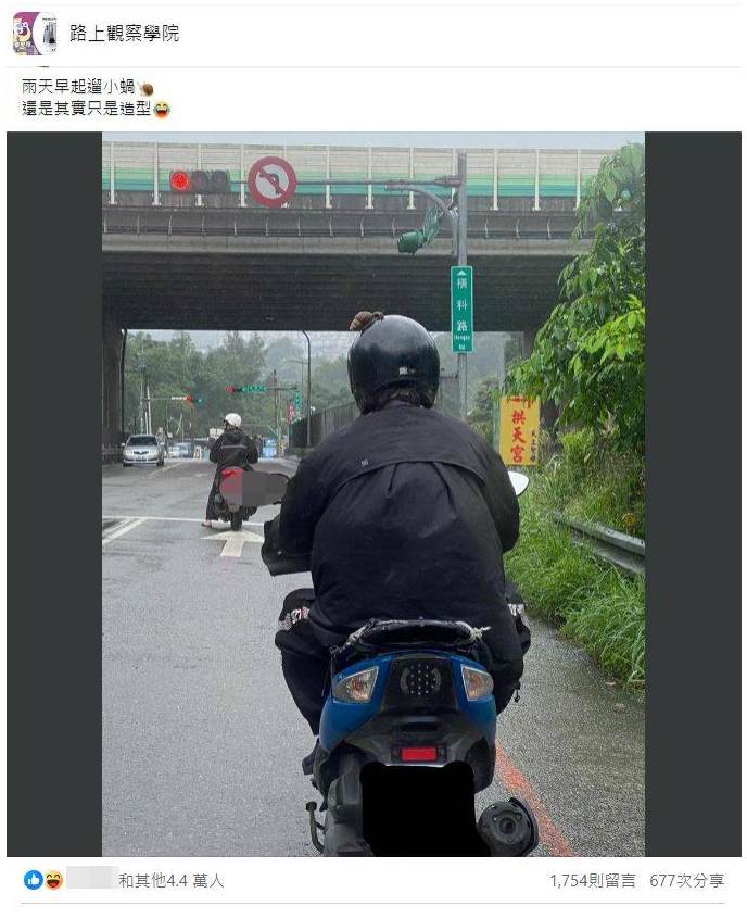 原來,這位騎士的安全帽上赫然有一只碩大的蝸牛,他似乎毫不自覺,任由這只意想不到的「搭便車者」隨車共行。面對如此奇景,一位騎車經過的路人不禁掏出手機拍下了這一幕,并忍俊不禁地上傳到臉書社團《路上觀察學院》,引發了網友們的熱烈討論。