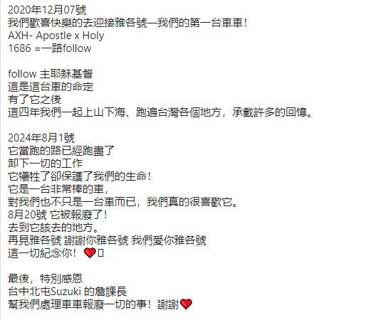 這輛車不僅僅是個代步工具,更像是她的家人。在隨后的敘述中,五熊透露,這輛車陪伴了她和丈夫整整4年。無論是風雨交加的夜晚,還是陽光明媚的假期,他們都一起度過了無數美好的時光。正如她在個人賬號中所言:「這4年,我們一起上山下海,跑遍了台灣的每一個角落。」 雅各號不僅承載了他們的旅程,也承載了他們的記憶和笑聲。