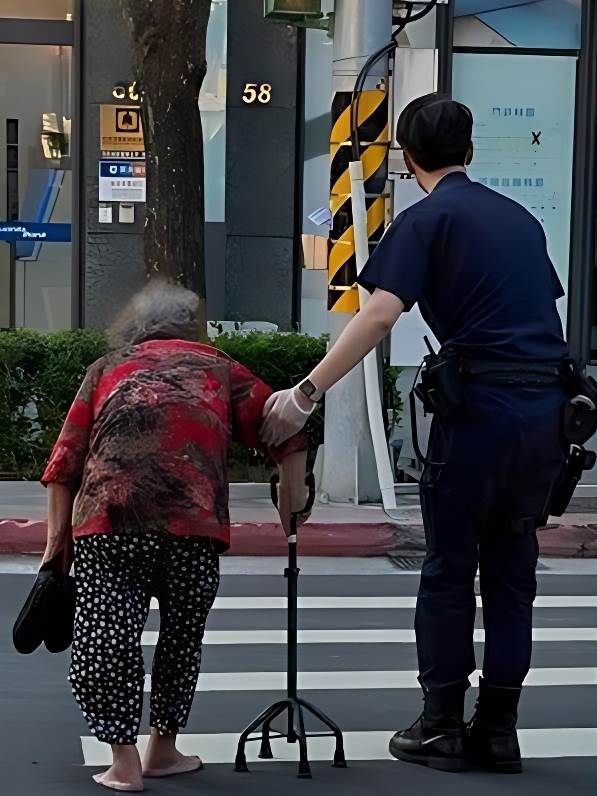 接著,這位員警彎下腰,試圖通過老人家手中的手機與她的家人取得聯系。他不僅耐心地安撫老人,還細心地攙扶她,最終陪伴她安全地走過了繁忙的馬路。