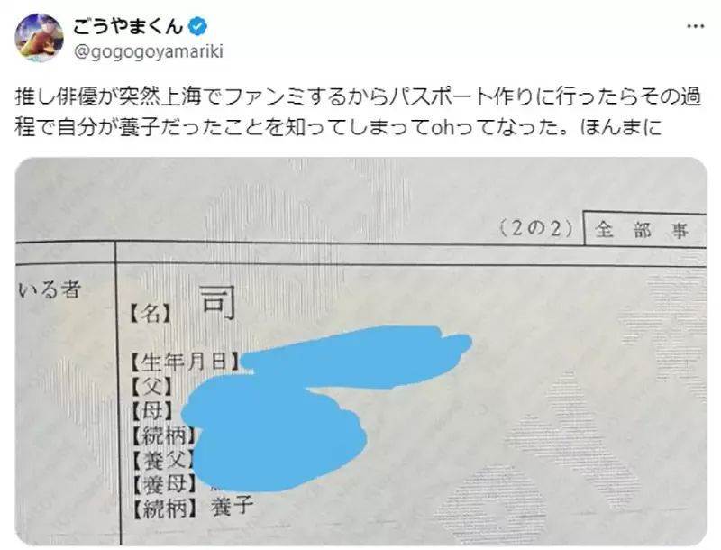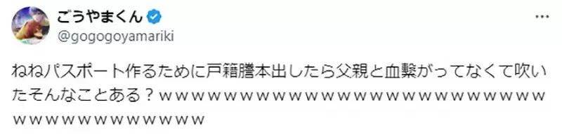 「ごうやまくん」在社交媒體上幽默地分享了這一發現:「喂,我為了辦護照調閱戶籍謄本,結果發現我跟爸爸沒有血緣關系,讓我笑了,竟然有這種事?」他輕松的語氣和樂觀的態度引發了網友們的廣泛討論。