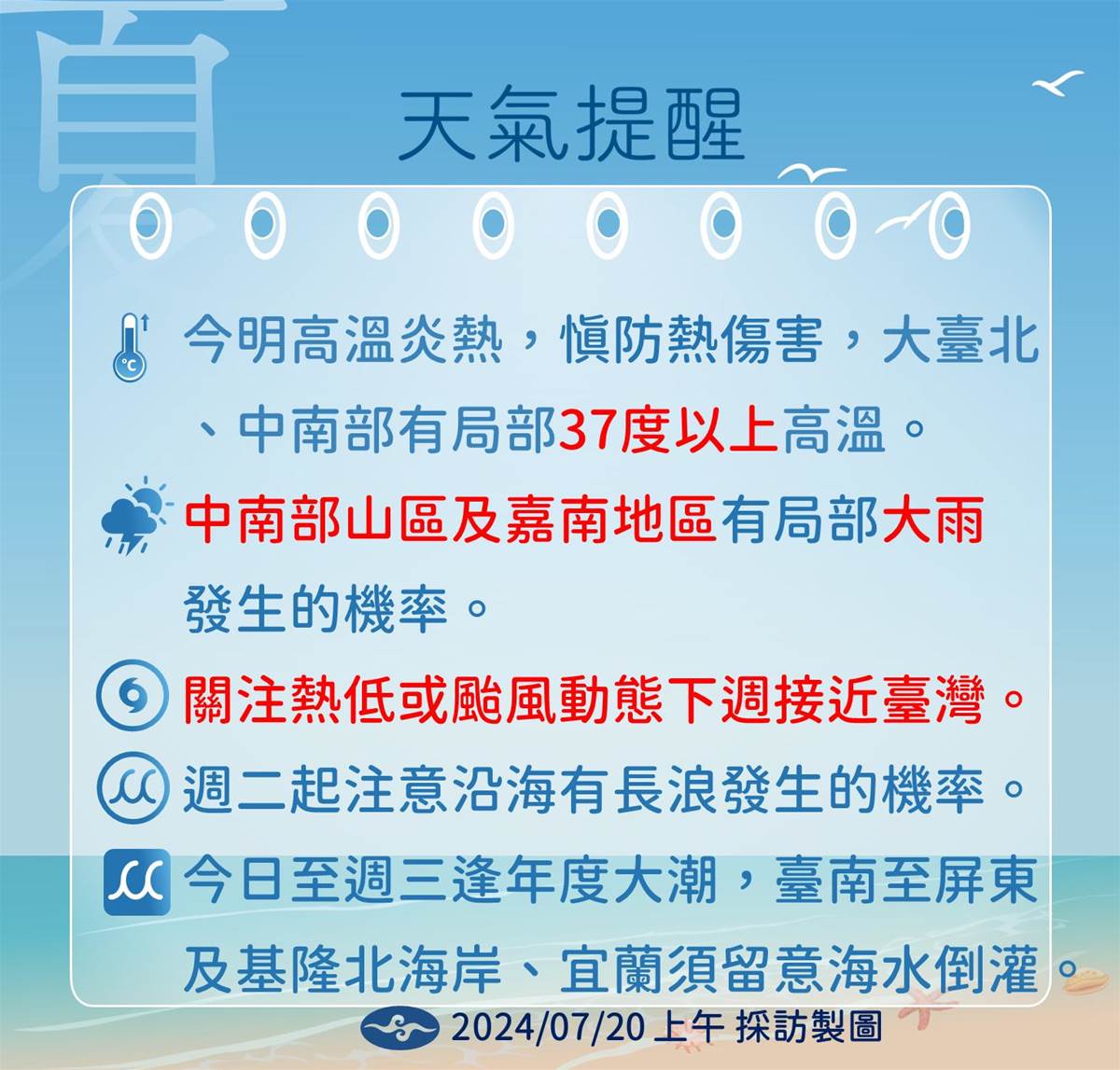 氣象署指出,週一起基隆北海岸、東半部地區、蘭嶼、綠島及恆春半島沿海有長浪發生機率,週四起西南部沿海及馬祖亦有長浪發生的機率,前往海邊請特別注意安全;另外20日至24日適逢年度大潮,臺南至屏東及基隆北海岸、宜蘭在漲潮期間,沿海低窪地區易有海水倒灌或局部淹水等現象,請注意。