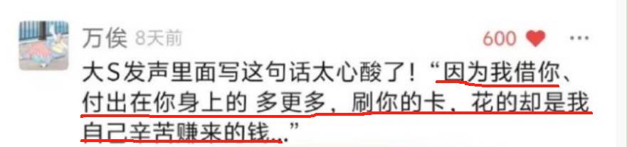 許是不想讓網友們被大S煽情的語言「蒙騙」,于是,張蘭直接使出了殺手锏,在這條評論下方,曝出了大S的猛料。