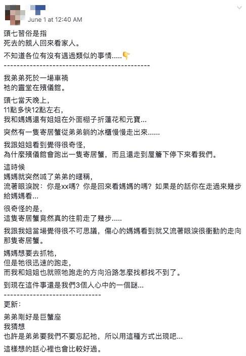 盡管原PO與姐姐在事后努力尋找那只寄居蟹,卻再也沒有發現它的蹤跡。母親堅信,這只寄居蟹并不是普通的生物,而是兒子的靈魂短暫回歸,為了不讓家人太過牽掛,他最終選擇離去。