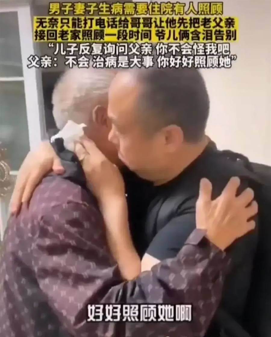 「我真的沒有辦法,孩子要讀書,妻子生病了,把你留在我家,沒有人照顧你,真對不起你!」說著,男子哭了起來,在父親的額頭上親了親。