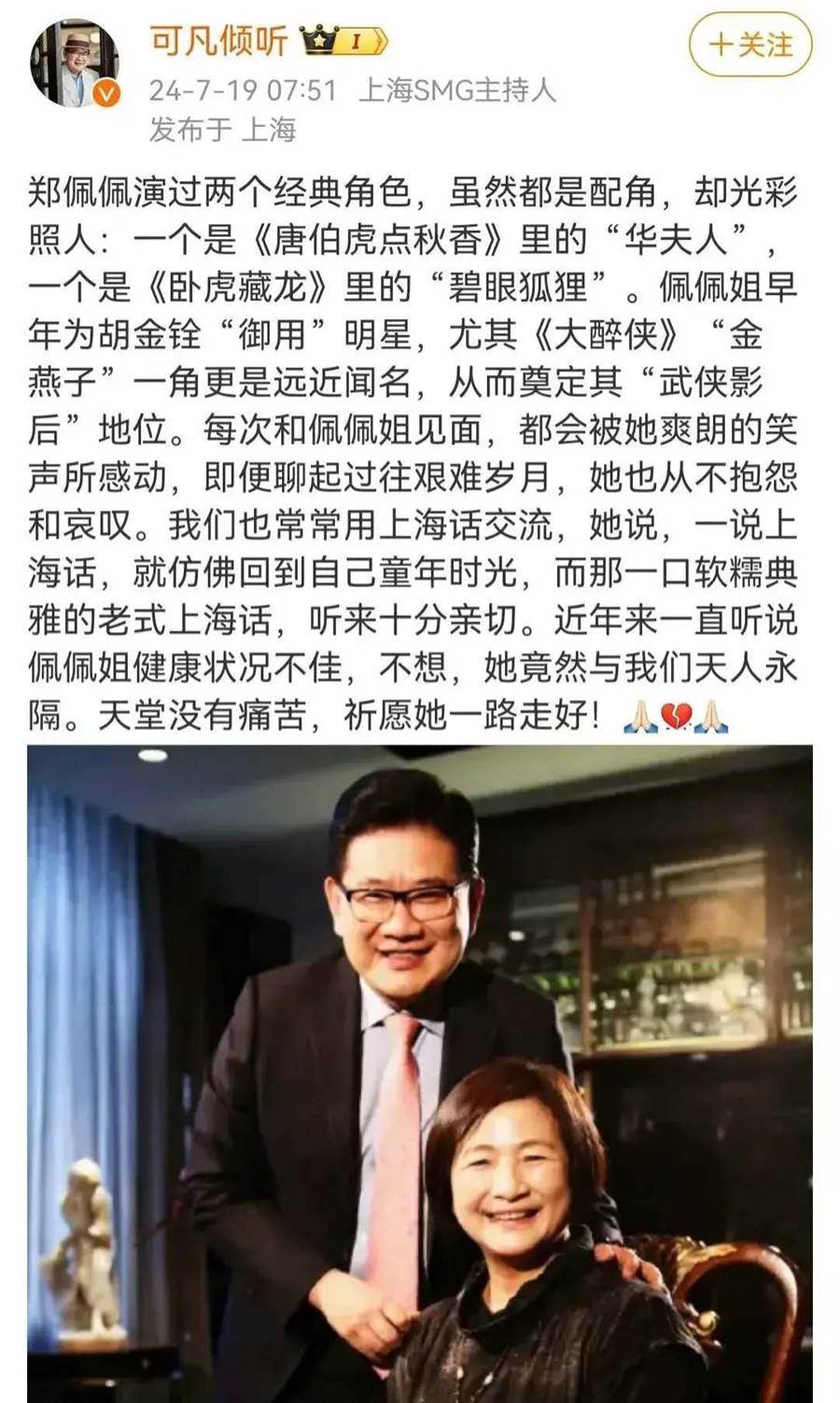 知名主持人曹可凡發文,還有很多業內大咖凌晨發文,爆出鄭佩佩已經去世的消息,一時間讓人難以接受。